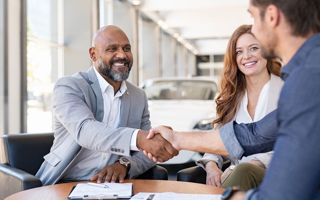Dealer discussing vehicle options with a client inside a modern car showroom.